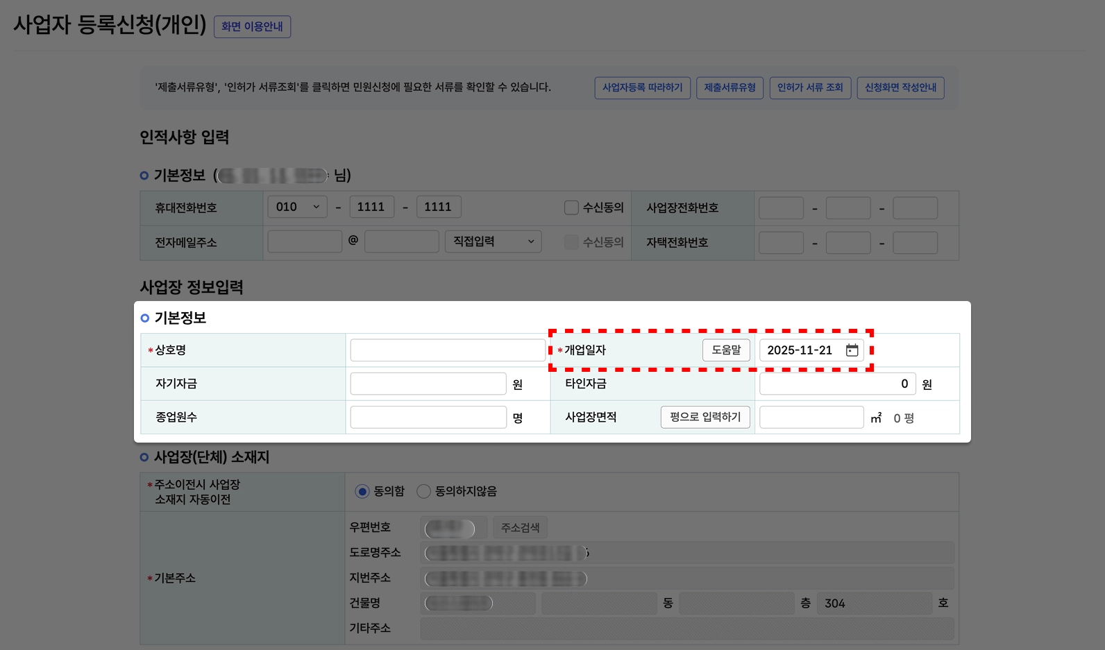 기본정보도 전부 입력 해주셨다면 개업일자는 신청 당일로 해주시면 됩니다