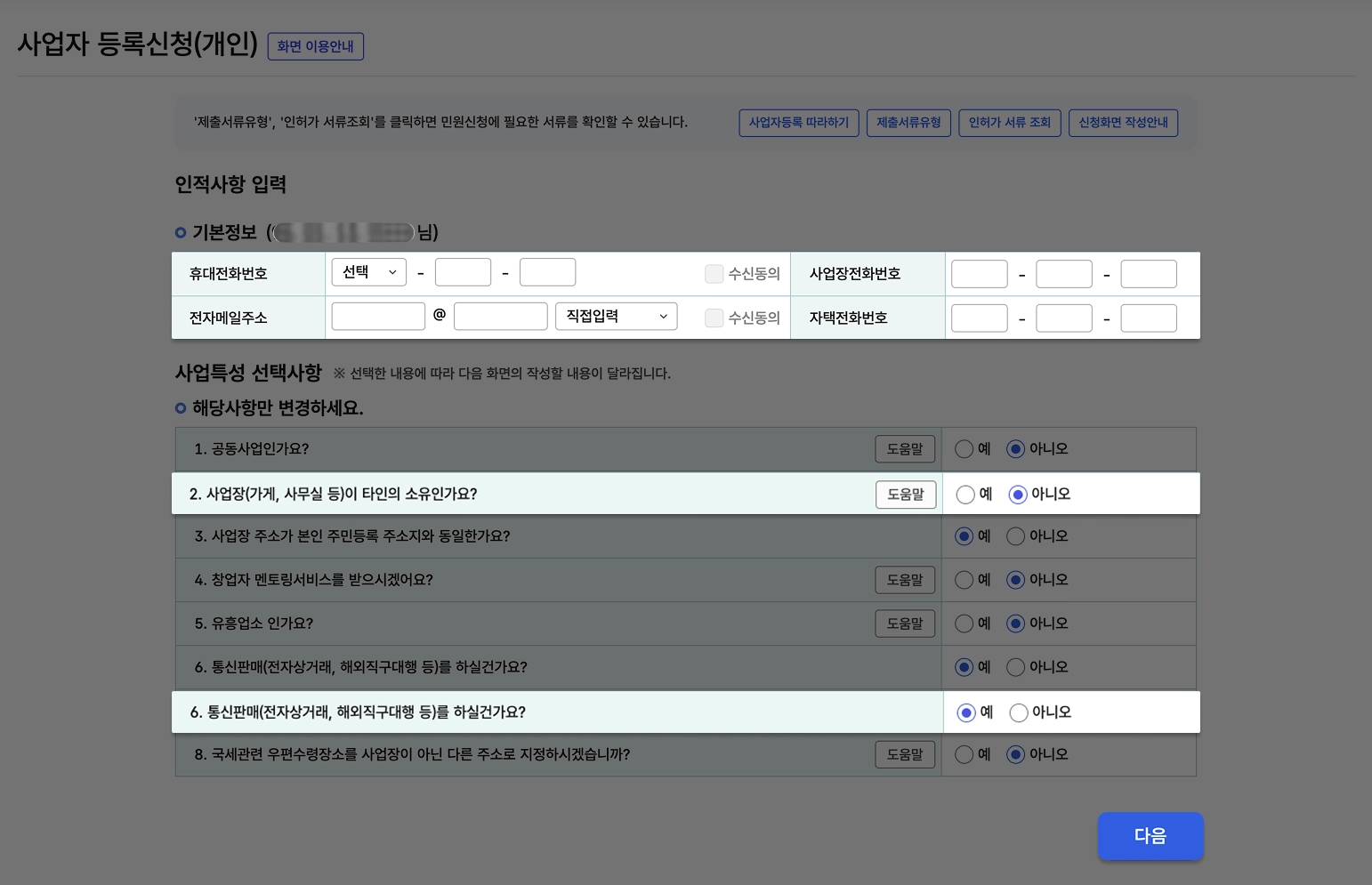 6번 통신판매(전자상거래, 해외직구대행 등)를 하실건가요? → 예 를 선택해주세요