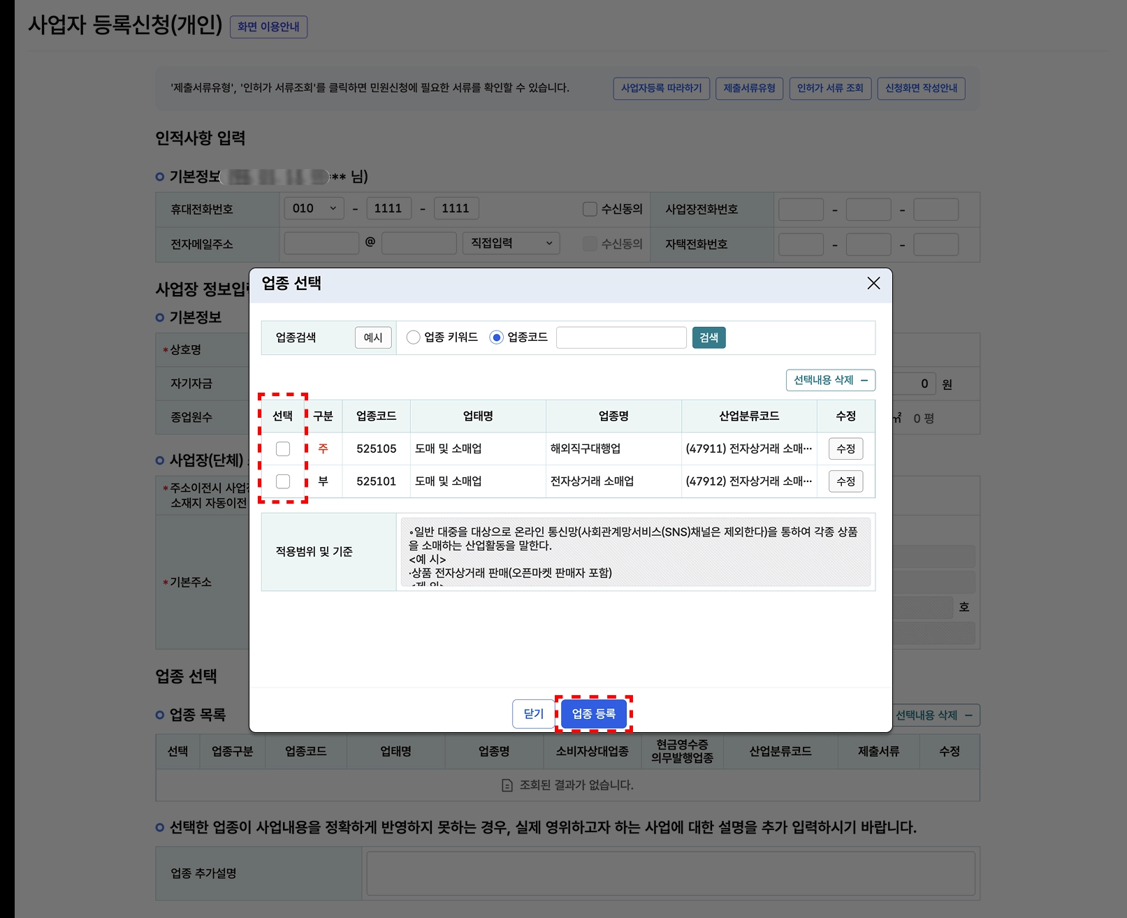 모두 되셨다면 체크후 업종 등록 으로 마무리 해주세요 !