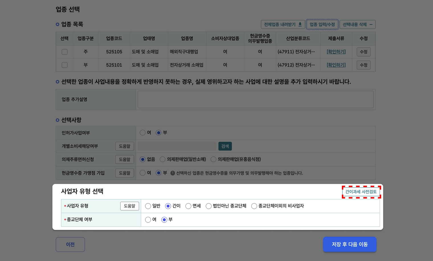 자 이제 업종 선택 들어가볼게요! 주업종,부업종 2가지 모두 입력 해주셔야해요.