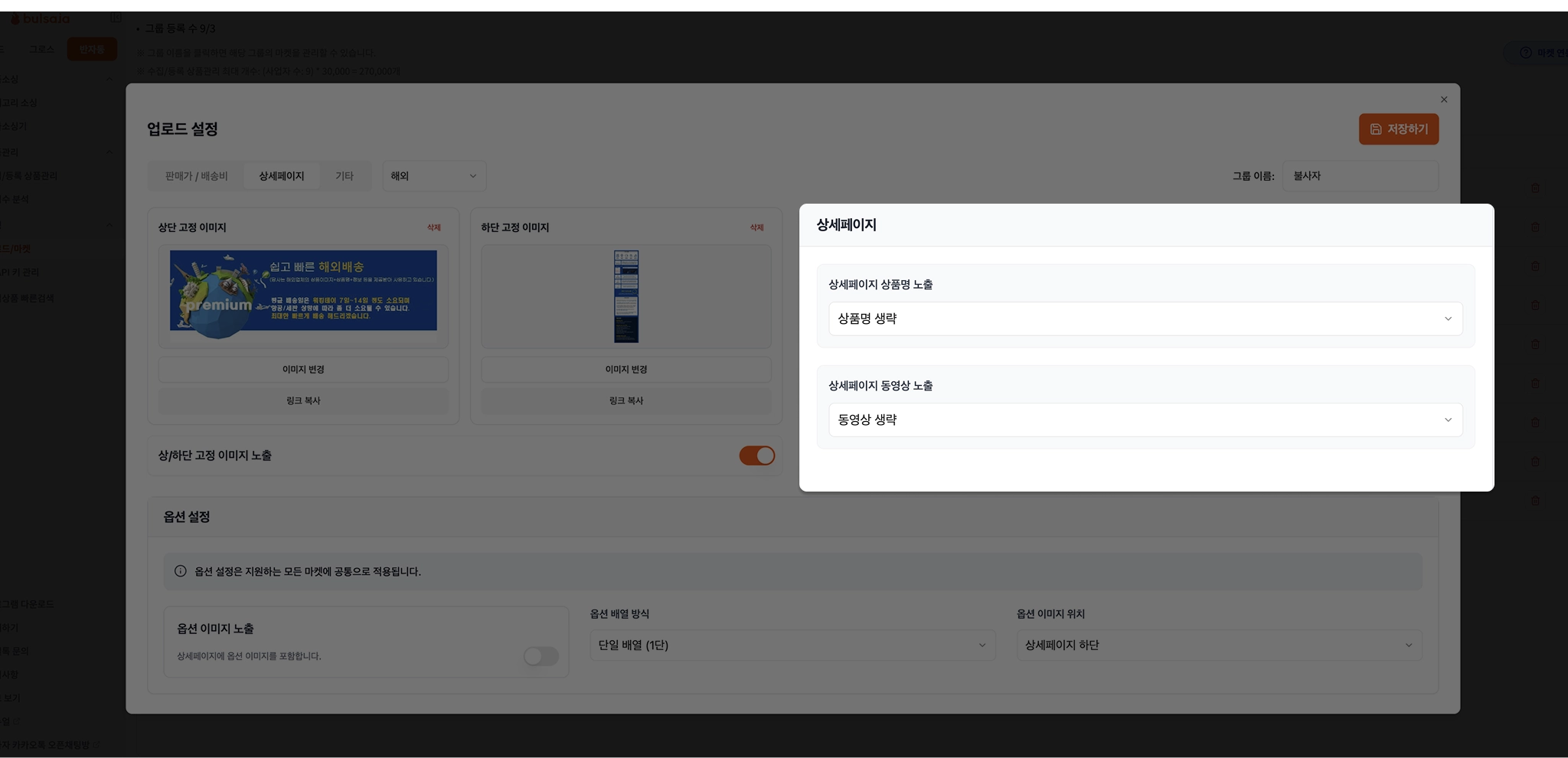 업로드설정의 상세페이지 화면이에요! 좌측부터 봐주세요 -! 보시면 상/하단 고정 이미지가 있어요.