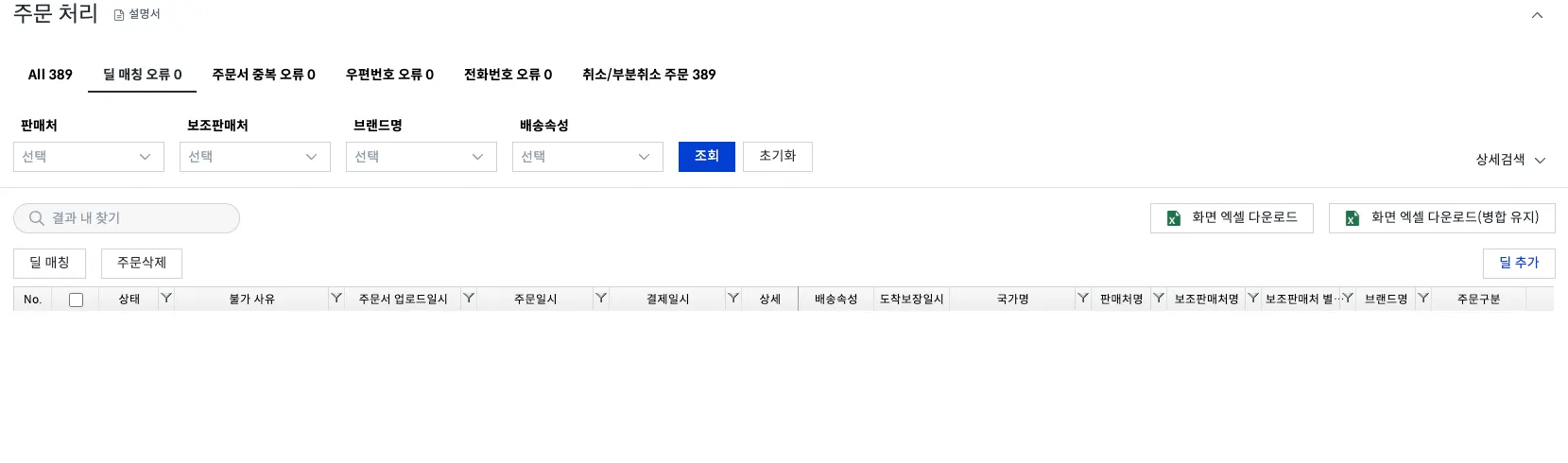 주문> 처리> 딜 매칭 오류 에서 확인이 가능합니다.