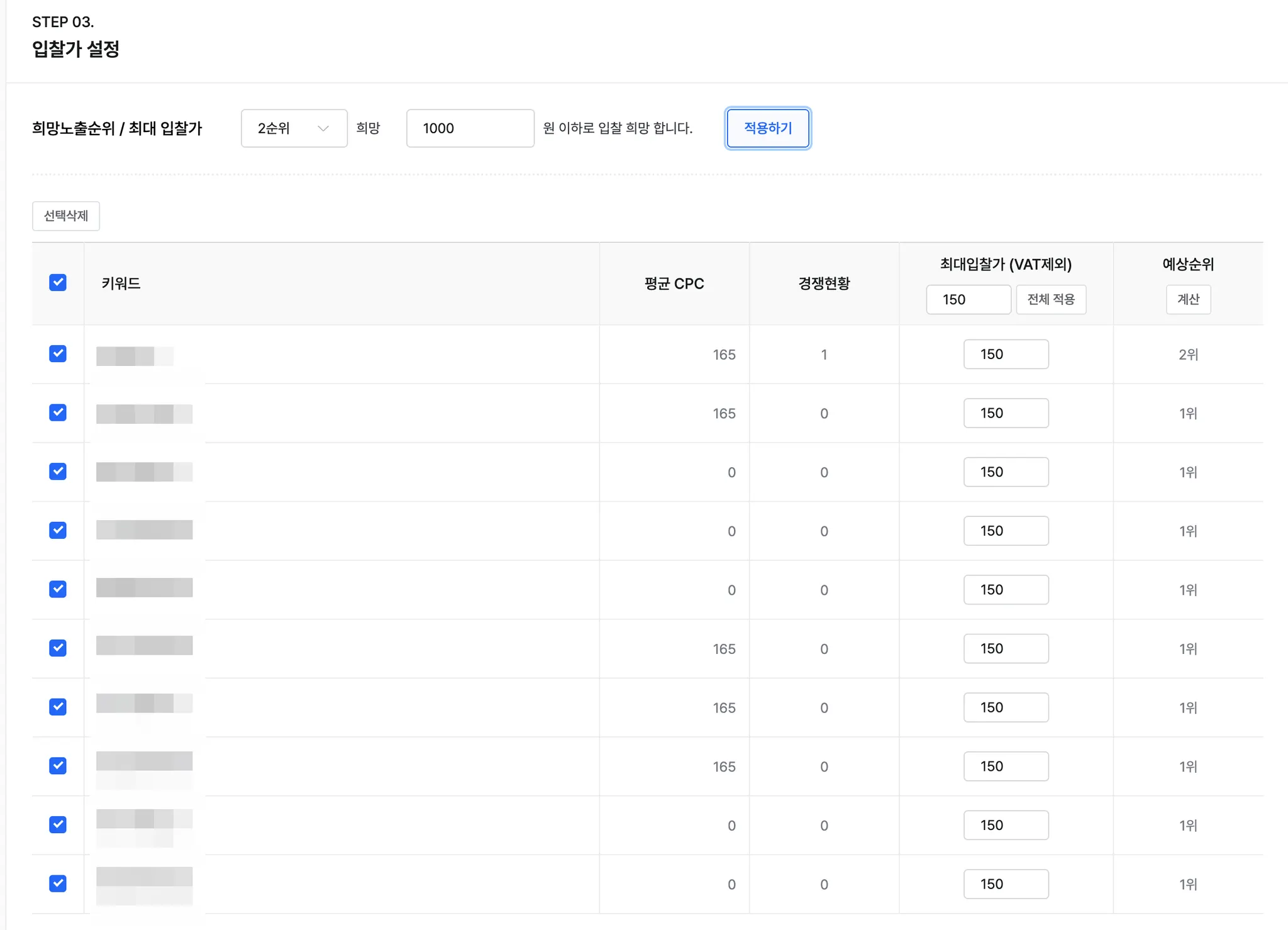 6. 키워드 선택 후 희망노출순위/ 최대 입찰가를 선택합니다.