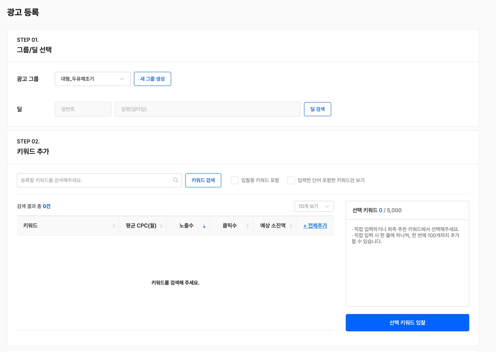 5. 선택키워드에 키워드를 입력→ 선택 키워드 입찰을 진행합니다.