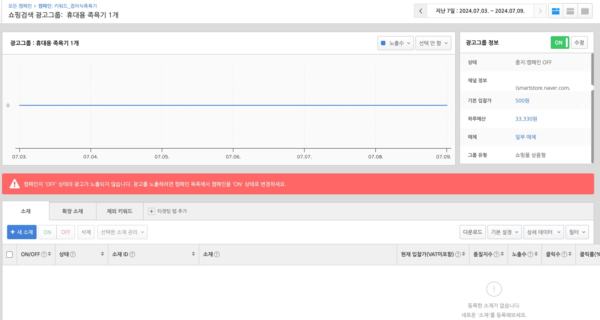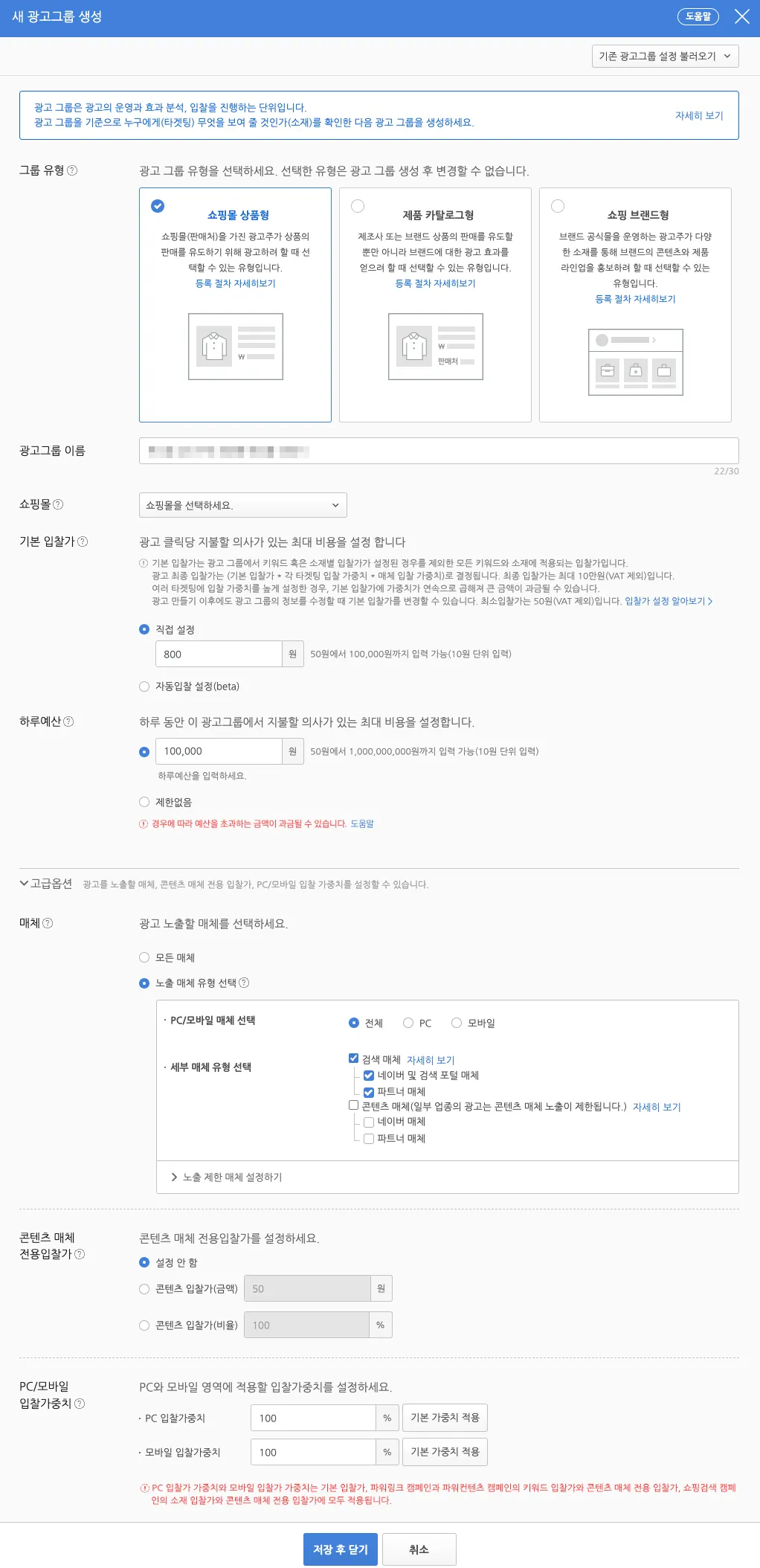 광고 그룹에 설정된 부분에서 광고그룹 이름을 시작 전에 설정한 그룹명 중 하나로 설정합니다.