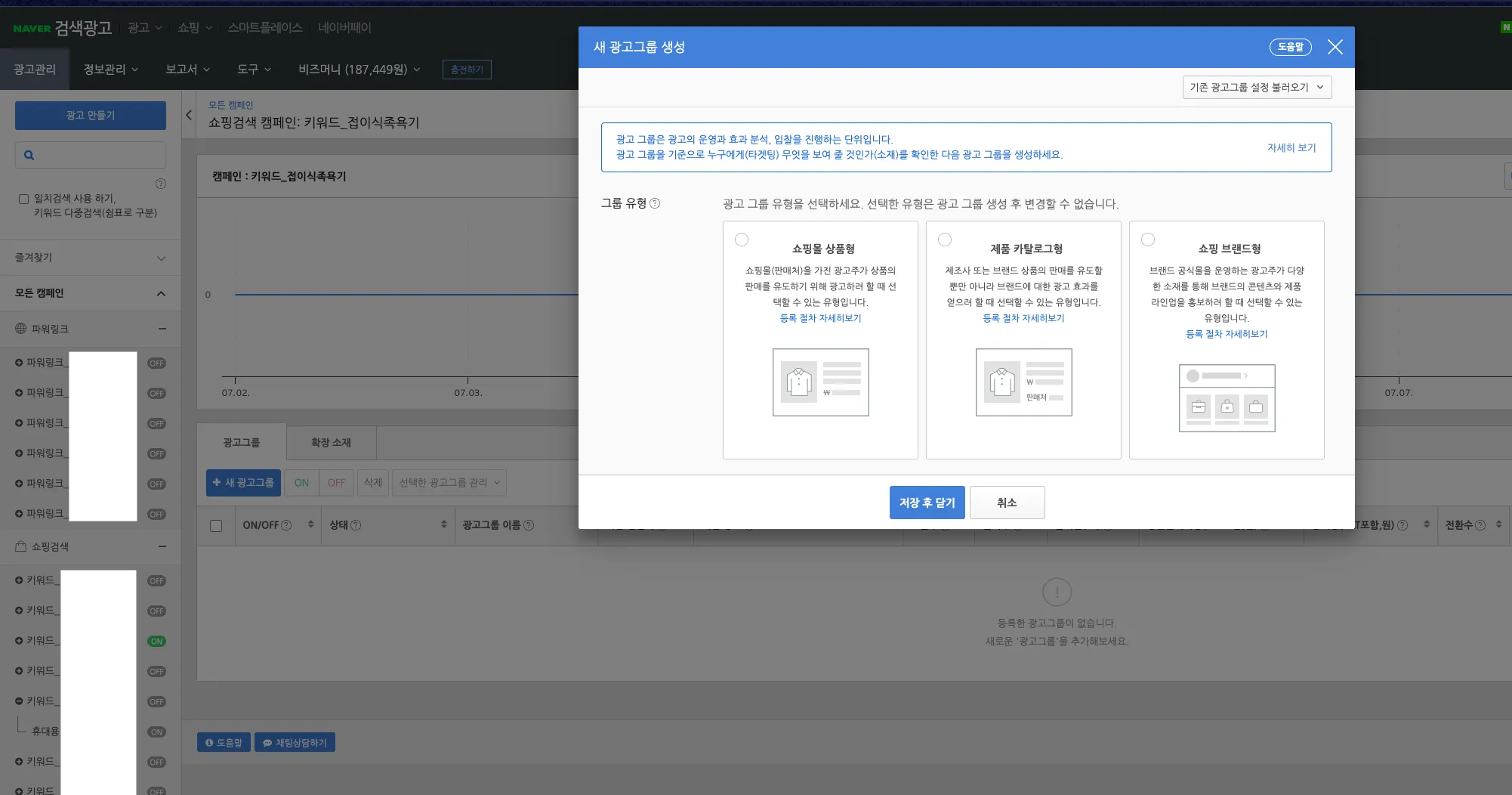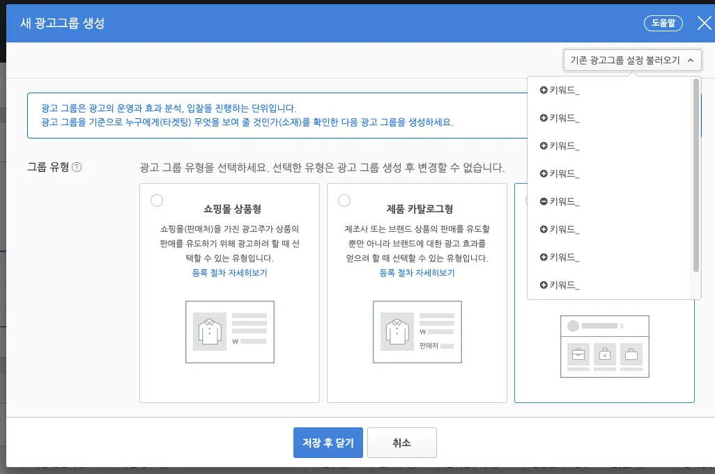 우측 상단 기존 광고그룹 설정 불러오기를 클릭합니다.