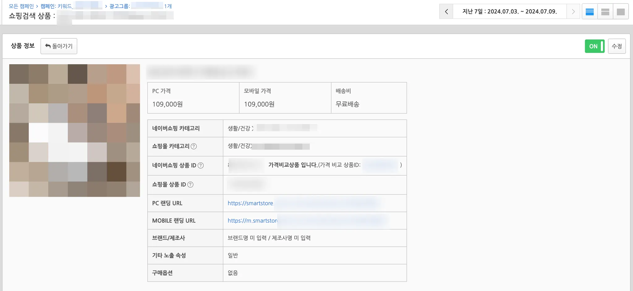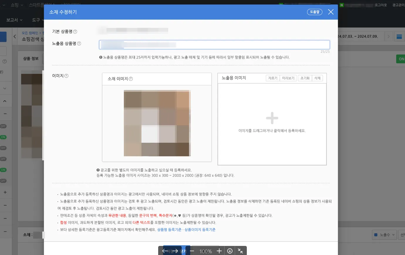 7. 소재 상세보기에 들어왔다면 수정 버튼을 클릭하여 노출상품명을 변경합니다.