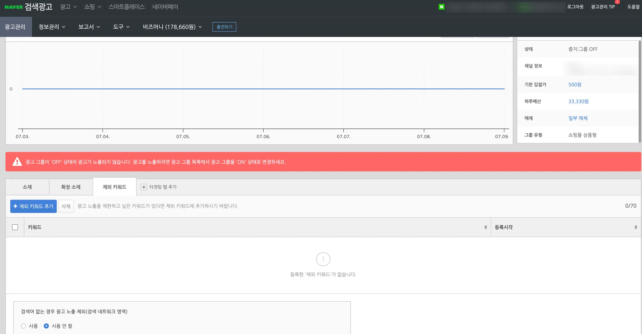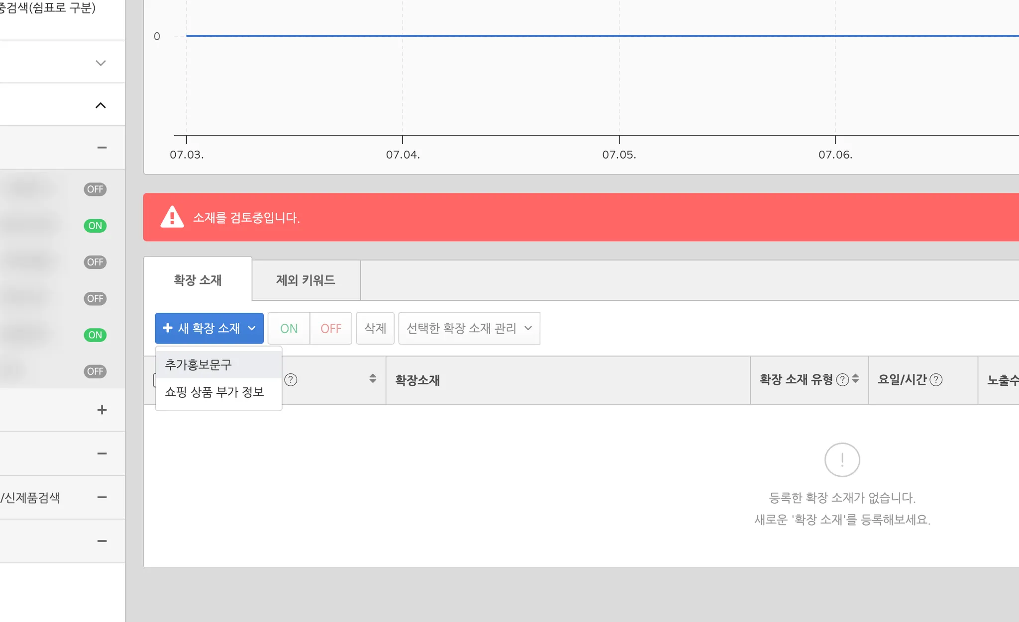 1. 생성된 확장소재 또는 그룹에 제외 키워드를 설정합니다.