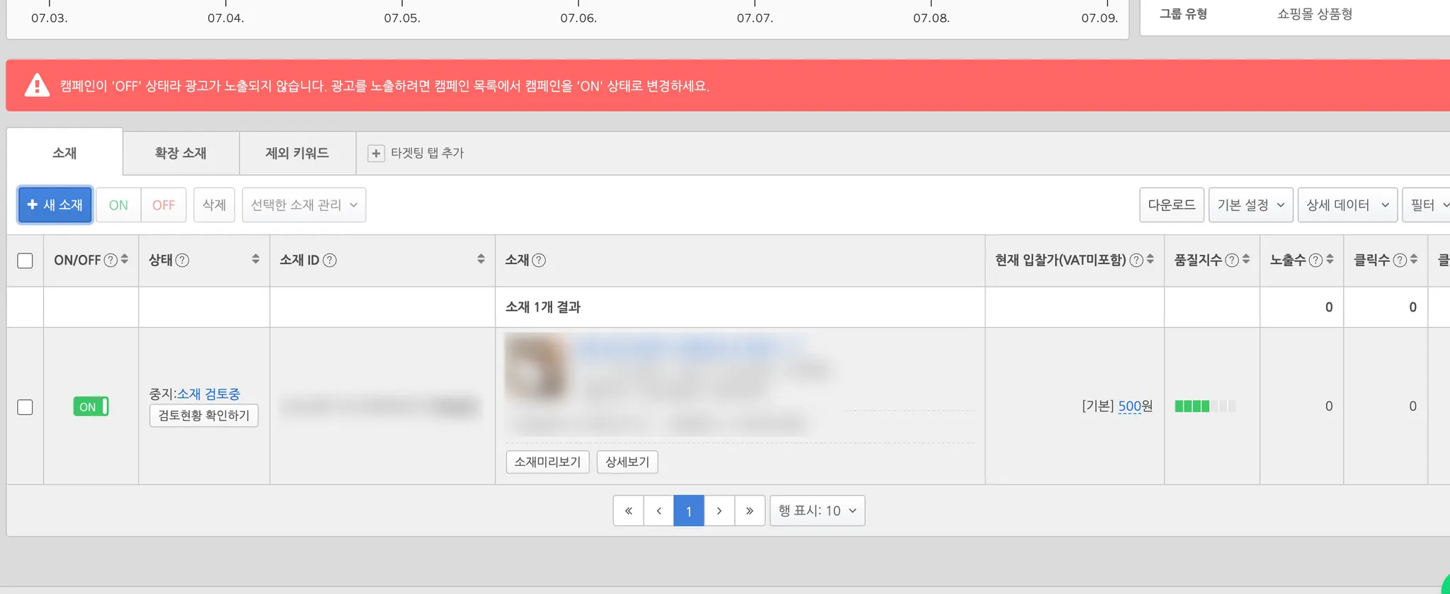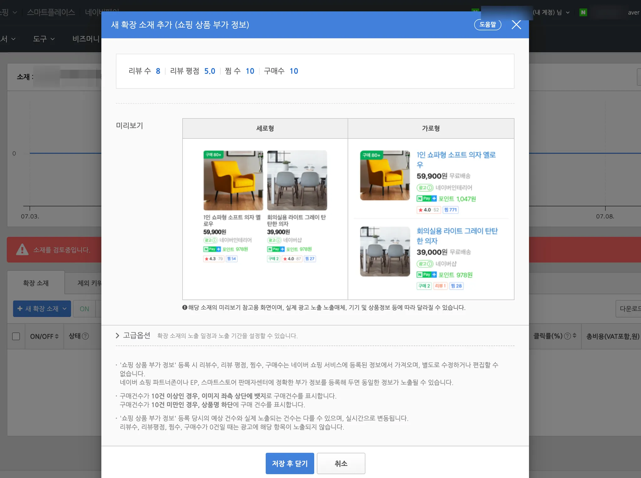 8. 노출상품명 변경 후 새 확장 소재를 추가합니다.