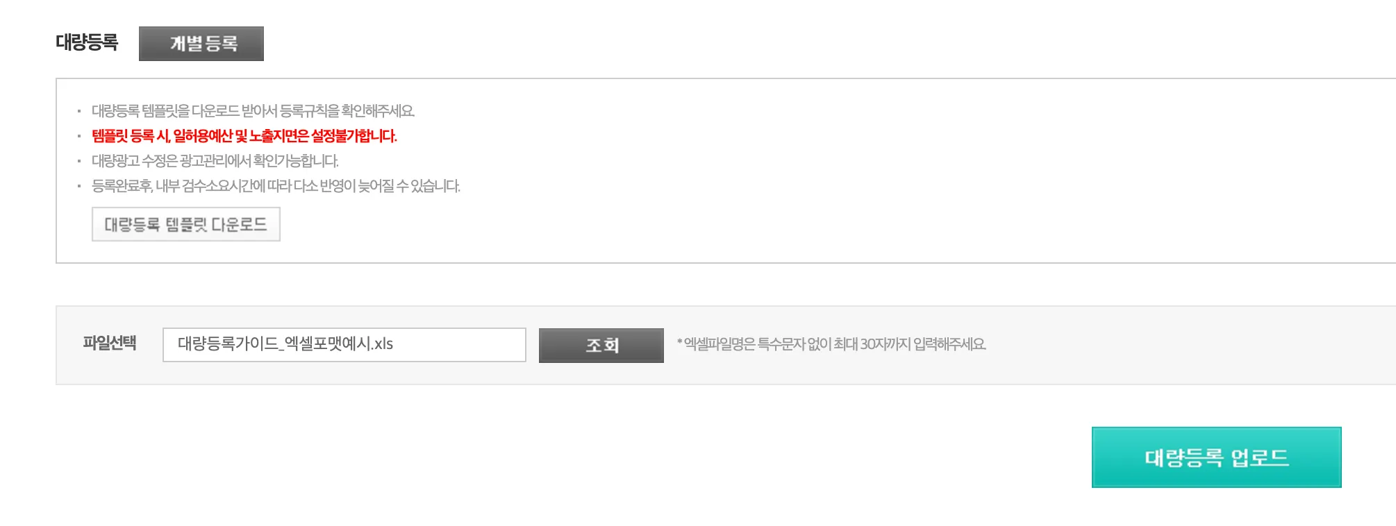 11. 대량등록에서 파일선택 후 업로드를 진행합니다.
